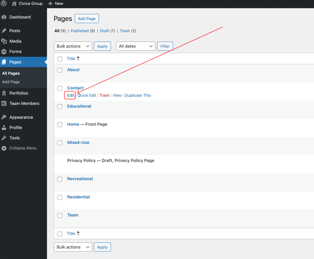 From the left-hand menu, click Pages, then hover over the Contact page and click Edit.